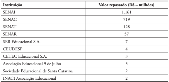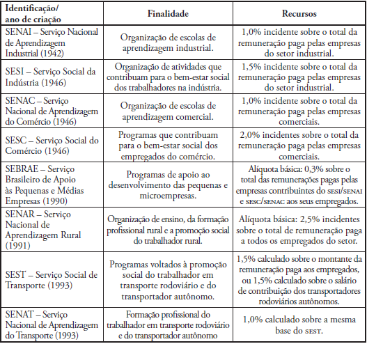 Como já comentado, trata-se de um dos modelos mais antigos de transferência de recursos públicos para o setor privado. Muito embora o setor empresarial privado procure alardear que os recursos do Sistema "S" são bancados pelo próprio setor, trata-se de uma falácia, uma vez que são tributos arrecadados pela Receita Federal do Brasil (RFB) como os demais, tendo por base essencialmente a folha de pagamentos e, como tributos indiretos que são, têm seu valor repassado ao preço final dos produtos, recaindo o ônus de seu pagamento ao consumidor, e não ao empresário que tão somente o recolhe. Diferentemente, contudo, dos demais tributos que vão compor o fundo público, os recursos do Sistema 'S' são destinados às entidades empresariais patronais que os administram de forma bastante descentralizada e pouco transparente em termos de prestação de contas. O Quadro 1 apresenta uma síntese dos seus diferentes componentes.