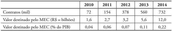 A princípio, não se pode afirmar que um programa de financiamento estudantil represente transferência de recursos públicos para o setor privado. Afinal, trata-se de um empréstimo bancário que, espera-se, será pago após a formatura nos termos do contrato assinado. Nesse sentido, não caberia incluir neste trabalho uma análise do FIES, que surgiu em 1999, no Governo Fernando Henrique Cardoso, inicialmente por meio de Medida Provisória, e, posteriormente, foi regulamentado na Lei nº 10.260/2001. Contudo, existem dois motivos que tornam essa análise imprescindível. Em primeiro lugar porque há um subsídio significativo, ou seja, para financiar o programa, o governo federal lança títulos se comprometendo a pagar uma remuneração que é bem abaixo daquela que será cobrada dos estudantes que firmarem contratos de financiamento. Não é à toa que o já citado § 4º do art. 5º do PNE considera como investimentos públicos em educação para efeito do cumprimento da Meta 20 "os subsídios concedidos em programas de financiamento estudantil". Contudo, mais grave que o subsídio embutido na diferença entre as taxas de juros do programa é o histórico dos programas de financiamento estudantil no Brasil que será apresentado a seguir tendo por base o estudo de Queiroz (2015). Tudo começou com o programa de Crédito Educativo, criado em 1975, na época da Ditadura Militar, cuja principal política para atender à demanda represada pela educação superior foi liberar a criação de instituições privadas de ensino (MARTINS, 1981). Em 1992, no Governo Collor, também de viés privatizante, o programa se transformou no Programa de Crédito Educativo para Estudantes Carentes (CREDUC). Ora, o FIES veio a substituir o CREDUC simplesmente porque esse programa foi à falência. Em 1997, último ano do programa, a inadimplência era de 83% e, em 2005, ainda havia mais de 145 mil contratos ativos no valor de R$ 2,5 bilhões, sendo que 55% dos contratos possuíam dívidas acima de $ 10 mil. Para resolver as pendências do CREDUC, o governo federal promoveu uma anistia que praticamente perdoava boa parte das dívidas dos contratantes (MEC, 2005). Ou seja, mais do que o subsídio embutido na taxa de juros, o grande e provável fim do FIES será uma dívida impagável para seus milhões de contratantes. Ocorre que essa hecatombe financeira de vários bilhões de reais começará a produzir seus efeitos apenas daqui a três ou quatro anos, quando os concluintes que ingressaram no boom do FIES tiverem de acertar suas contas com a Caixa Econômica Federal ou com o Banco do Brasil, os operadores do sistema. A Tabela 8 apresenta os grandes dados do programa.