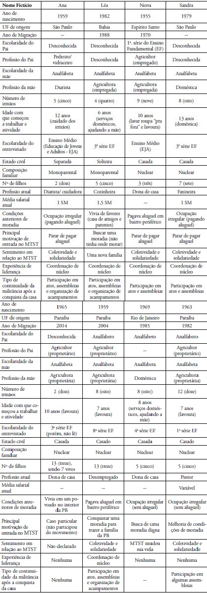 Pelos dados coletados junto às famílias do condomínio, podemos afirmar que os oito entrevistados representam o perfil majoritário dos moradores do João Cândido: trabalhadores e trabalhadoras migrantes, de origem rural; com baixa escolaridade; inseridos no mercado informal de trabalho ou no setor de serviços, em postos que não exigem qualificação profissional específica; cujos filhos, em geral, estão matriculados na escola, embora não sejam incomuns casos de fracasso e abandono escolar. A condição social do grupo fica mais clara quando a comparamos com alguns indicativos da população brasileira: enquanto a escolaridade média dos indivíduos com mais de 25 anos de idade atingiu o patamar de 7,7 anos de estudo, os entrevistados têm em média 3,5 anos de escolaridade; em relação às taxas de natalidade, enquanto as mulheres brasileiras têm em média 1,9 filho, entre as entrevistadas a média é de 5,3 filhos (IBGE, 2010).