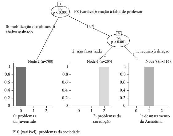 Assim, de modo a verificar como a escolha do abaixo-assinado poderia ter a ver com um perfil subjetivo mais “geracionalizado” de estudante, e, portanto, mais suscetível de produzir “causas” a partir de sua condição específica de existência na escola, buscou-se relacionar a reação do estudante contra a falta sistemática do professor e os problemas sociais por ele considerados prioritários. A análise estatística chamada “árvore de classificação” foi utilizada2. As opções de resposta na variável considerada independente - as reações contra a injustiça - foram agrupadas em três níveis: mobilização dos alunos (incluindo as opções de discutir com o grêmio a injustiça e de organizar um abaixo-assinado); o recurso à direção (incluindo esperar a direção resolver e reclamar com a direção); não fazer nada.