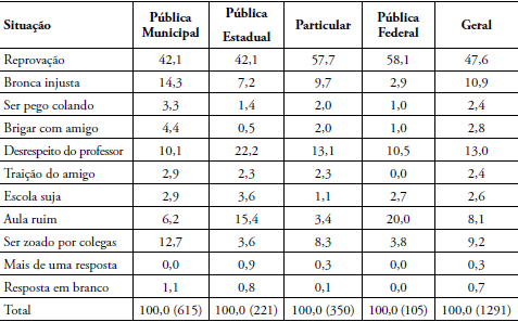 A primeira situação, retirada de pesquisas anteriores, visou saber a “situação mais difícil na escola” para os estudantes. Entre as opções de respostas havia situações relatadas pelos próprios alunos em uma etapa anterior da pesquisa como sendo momentos difíceis que geravam indignação, medo e/ou revolta, retratando situações difíceis, seja entre pares ou entre alunos e seus professores, seja como aspectos da institucionalidade escolar (Tabela 1).
