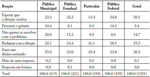 Uma outra pergunta do questionário citado pedia para os estudantes se posicionarem diante da situação de falta sistemática de uma professora para alguma disciplina, situação, infelizmente, bastante frequente nas escolas públicas do Estado. Por meio dessa pergunta, objetivou-se avaliar as reações dos estudantes ao que se considera como rompimento do pacto educacional. Espera-se, de um lado, que os alunos estudem e cumpram seus deveres como estudantes, e, de outro, que a escola funcione, os professores deem suas aulas e transmitam o conteúdo que os alunos devem aprender. A situação de falta sistemática de um(a) professor(a) sinaliza que a base normativa que regula e legitima a reciprocidade de relações entre alunos e professores se fragiliza diante do não cumprimento dos deveres de uma das partes. Por meio dessa pergunta, também procurou-se avaliar como uma situação de injustiça pode resultar em indignação, já que é baseada na demanda legítima de restabelecer o pacto educacional rompido.
