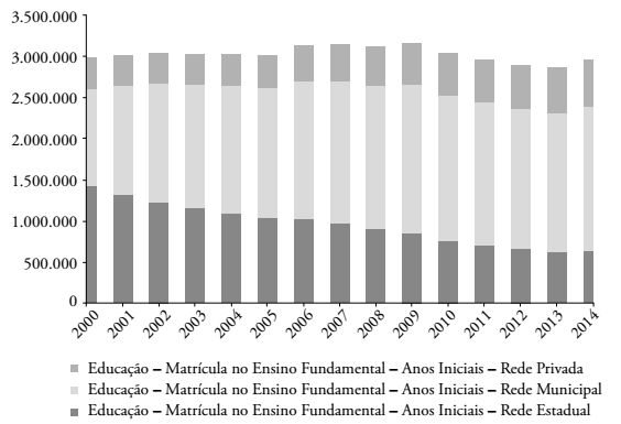 Considerado o período de 2000 a 2014, a tendência das matrículas nos Anos Iniciais do Ensino Fundamental é de estabilidade no patamar de 3 milhões de estudantes, com o aumento da participação das redes municipais e privada, e retração da rede estadual (Figura 1).
