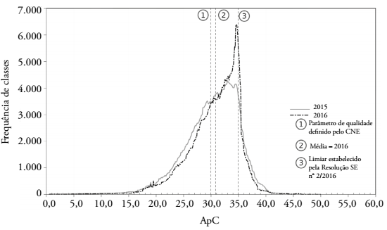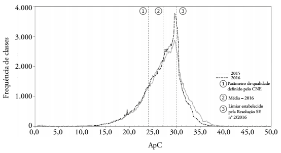 Na Tabela 2 e nas Figuras 10, 11, 12, 13 e 14, podemos notar uma diferença significativa entre as médias de alunos por classe em cada modalidade e as respectivas modas14. Estas, em cada modalidade, são significativamente maiores do que aquelas, indicando uma grande concentração de classes com mais alunos do que a média. A forma dos gráficos não é simétrica, e eles apresentam máximos deslocados para a direita, que indicam uma “preferência” por classes com muitos alunos, tendência que se mostra intensificada nas curvas relativas a 2016.