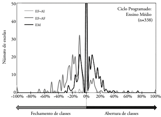 Os mesmos dados também podem ser apresentados graficamente, na forma de curvas de distribuição porcentual de abertura/fechamento de classes. A Figura 15 mostra essa distribuição para o subconjunto das 338 unidades escolares que, na proposta de reorganização apresentada em 2015, se tornariam escolas exclusivas de Ensino Médio18.