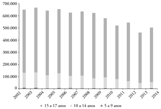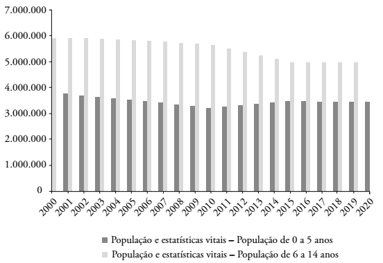 As estatísticas vitais para a população infantojuvenil são coerentes com o comportamento das matrículas, evidenciando uma redução da população entre 6 e 14 anos no período de 2008 a 2014, e uma estabilização a partir de então no patamar de 5 milhões de crianças e adolescentes em idade de frequentar o Ensino Fundamental (Figura 2). Se a população de 0 a 5 anos se estabilizar em torno de 3,5 milhões de pessoas, conforme indicam as projeções demográficas, então é razoável supor que as matrículas nos Anos Iniciais do Ensino Fundamental também se estabilizem nesse patamar.
