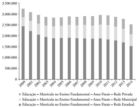 No caso das matrículas dos Anos Finais do Ensino Fundamental, nota-se uma tendência de redução no volume total de matrículas no período de 2000 a 2014 (tendência que se acentua a partir de 2012), que em parte pode ser relacionada ao movimento demográfico, mas não apenas a ele, afetando especialmente a rede estadual, que diminui sua participação relativa na oferta total de vagas nessa etapa (Figura 3).