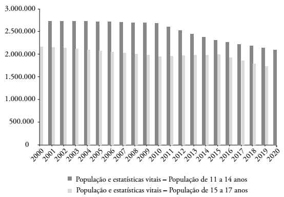 Na população de 11 a 14 anos, a tendência foi de decréscimo do número total de adolescentes a partir de 2010, o que pode repercutir na demanda futura por vagas nos Anos Finais do Ensino Fundamental se houver uma regularização do fluxo escolar. Na atualidade, esse impacto não é tão significativo devido ao elevado contingente de estudantes que frequentam essa etapa do ensino com defasagem na relação idade-série, em virtude de reprovações e interrupções nos estudos, o que explica que a taxa bruta de matrícula exceda os 100%.