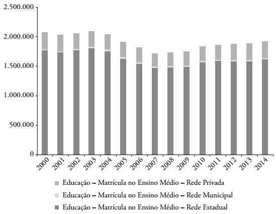 É fato que a rede estadual de ensino perdeu milhões de matrículas no transcorrer das duas últimas décadas, e que isso não se deve apenas às mudanças demográficas, mas também às transferências entre as redes de ensino. Na segunda metade da década de 1990 e princípio dos anos 2000, o movimento dominante foi o de municipalização do Ensino Fundamental; na última década, a diminuição de matrículas na rede estadual de ensino deve-se principalmente à progressiva privatização do ensino básico decorrente da fuga dos setores de renda média para a rede particular, uma das consequências da deterioração das condições de ensino e aprendizagem nas redes públicas, sobretudo a estadual, e seu consequente desprestígio7.