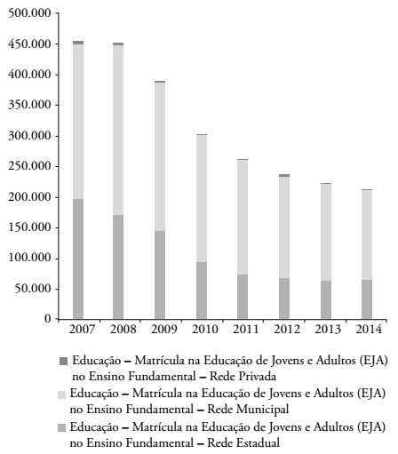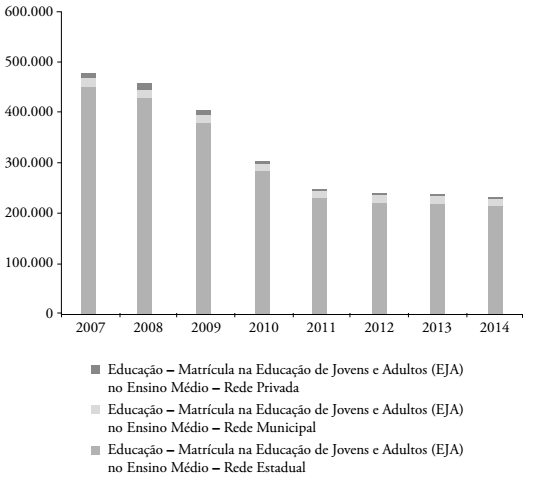 A Figura 6 mostra que 449 mil adolescentes de 15 a 17 anos, segundo a PNAD 2014, estavam ocupados na semana de referência da pesquisa. Quando considerada a faixa dos 15 aos 19 anos, esse volume saltou para 1,196 milhão de jovens e adolescentes. A difícil conciliação entre trabalho e frequência à escola é um dos fatores que explicam as elevadas taxas de abandono do Ensino Médio e da EJA. No caso desta, a situação do atendimento é dramática, seja pela baixa cobertura, seja pela acelerada e persistente redução das matrículas registrada desde 2006, que atinge todas as redes e etapas do ensino básico, sendo mais acentuada na rede estadual (Figuras 7 e 8).