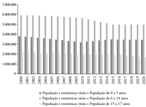 É importante notar que a queda da fecundidade (fenômeno demográfico que reduz o número absoluto e a proporção de crianças no conjunto da população) afeta cada faixa etária em um período (na população de 0 a 5 anos, ocorreu uma queda entre 2000 e 2010; na população de 6 a 14 anos, de 2009 a 2015; e assim sucessivamente, conforme apresentando na Figura 2), demonstrando que o fenômeno tem uma redução acentuada em certo período e depois alcança uma estabilidade.