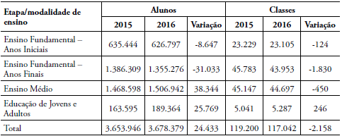 Em síntese, verifica-se que de 2015 a 2016 houve um discreto crescimento no volume de matrículas da rede estadual paulista, e uma variação significativa na distribuição de alunos por classe, que levou ao aumento da quantidade de classes com o número máximo de alunos previsto pela Resolução SE n° 2/2016 (SÃO PAULO, 2016). Na maioria dos casos, essa ação teve como resultado um incremento do número de classes mais cheias e uma diminuição do número de classes mais vazias, sendo particularmente grave a situação da EJA e dos Anos Iniciais do Ensino Fundamental.