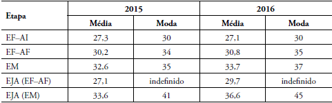 Nota-se que, em 2016, à exceção do Ensino Médio, nas demais etapas e na modalidade EJA a moda de alunos por classe é numericamente igual aos referenciais estabelecidos pela Resolução SE n° 2/2016 (SÃO PAULO, 2016) e que, na transição 2015-2016, o valor da moda de alunos por classe aumentou ou permaneceu inalterado em todas as etapas e modalidades consideradas. Particularmente intenso foi o aumento da moda de alunos por classe para a modalidade EJA no Ensino Médio, que saltou de 41 para 45 alunos por classe, indicando que a elevação dos referenciais para essa modalidade na Resolução teve repercussão imediata na gestão da demanda escolar.