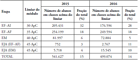 Logo, é legítimo supor que a gestão da demanda de matrículas na rede estadual paulista se orientou por uma diretriz que induziu à formação do maior número possível de turmas no teto legalmente admitido de alunos por classe. Poderíamos, então, nos perguntar se essa diretriz também gera, colateralmente, um número significativo de classes com número de alunos além do limite. Com efeito, a Tabela 3 evidencia que 14% dos alunos da rede estadual de São Paulo, em 2016, se encontram em classes com lotação acima do módulo definido pela Resolução SE n° 2/2016 (SÃO PAULO, 2016), proporção bem superior à declarada pela SEE-SP à Justiça e que não pode ser caracterizada como “excepcionalidade”.