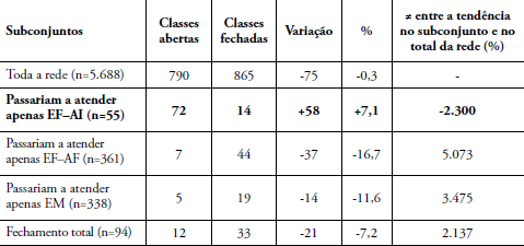 Em relação ao subconjunto das 94 unidades escolares que seriam totalmente fechadas segundo a proposta de reorganização de 2015, nota-se nas três tabelas uma tendência de fechamento de classes nas três etapas investigadas, muito maior nesse subconjunto do que no universo da rede.