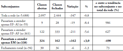 Para realizar essa comparação, calculamos a variação porcentual do número de classes16 para cada etapa de ensino no universo da rede estadual paulista e no universo dos subconjuntos que mencionamos. Os resultados, sistematizados nas Tabelas 4, 5 e 6, demonstram uma tendência muito diferente nesses subconjuntos em relação ao total da rede estadual.