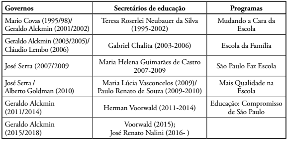 O primeiro foi o programa de reorganização do ensino da secretária Rose Neubauer da Silva - “Mudando a Cara da Escola” (1995/2002). Em resposta ao programa “Escolas Padrão”, do Governo Fleury (1991/1994), a nova proposta foi a de estimular melhor desempenho aos estudantes, sem o privilégio de escolas-modelo, uma vez que o sindicato dos professores - o Sindicato dos Professores do Ensino Oficial do Estado de São Paulo (APEOESP) - tinha combatido o projeto com o lema “Pouca ‘Modernização’ Para Poucos”. Para tanto, tratava-se de seguir o diagnóstico da época, de avançar quanto ao fluxo de aproveitamento dos estudantes, reorganizando as escolas, separando-as em três possibilidades: escolas de ciclo dos anos iniciais (1º ao 4º ano), escolas com as séries finais (5ª a 8ª série) do ensino fundamental e um ciclo do ensino médio (1ª a 3ª série). Não por acaso, a brutal municipalização das séries iniciais do ensino fundamental saiu do patamar de 10%, atingindo o percentual de 48%, em pouco menos de 4 anos da primeira Gestão Covas (1995/1998).