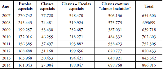 Como resultante do conjunto de ações, verifica-se que há o crescimento contínuo de matrículas de crianças da “educação especial” nas escolas comuns/regulares (Tabela 1) e a diminuição de matrículas em situações de escolaridade especial (classes ou escolas especiais).