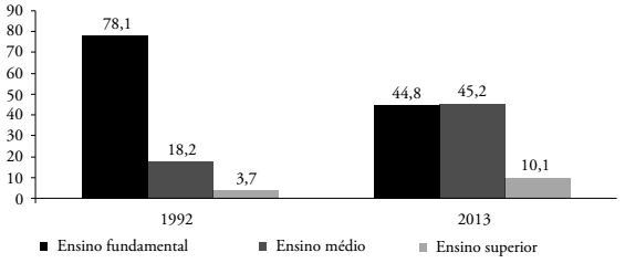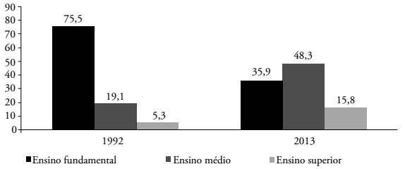 Entre os jovens desempregados com ensino médio na faixa etária de 15 a 29 houve aumento de quase 150,0% entre 1992 e 2013. Para o ensino superior, o crescimento relativo dos jovens desempregados foi ainda maior (multiplicado 2,7 vezes), pois passou de 3,7% para 10,1% no mesmo período de tempo.
