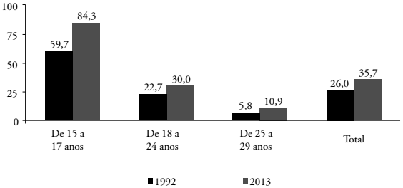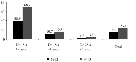 Outro aspecto significativo a revelar decorre da elevação da inatividade entre os estudantes na faixa etária de 15 a 29 anos de idade. No ano de 2013, quase 69,0% do segmento de 15 a 17 anos encontrava-se na condição de estudante, ante praticamente 39,0% em 1992, o que representou aumento de 76,6% no mesmo período de tempo.