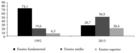 Entre os ocupados também houve elevação de escolaridade entre os jovens. No ano de 2013, menos de 29,0% das pessoas ocupadas de 15 a 29 anos de idade encontravam-se situados no ensino fundamental, ao passo que em 1992 compreendiam quase 80% do total (queda de 61,3%). Tais dados podem mostrar que o crescimento da população jovem no ensino médio e superior, acompanhado da diminuição da população de 15 a 17 anos de idade no ensino fundamental, revelaria o investimento dos jovens na escolaridade sob a ilusão da igualdade de chances.