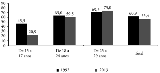 A expansão da parcela da juventude com acesso ao ensino foi acompanhada tanto do aumento na taxa de inatividade como da queda na taxa de ocupação. Entre 1992 e 2013, por exemplo, a taxa de ocupados caiu 5,5%, pois passou de 60,9% para 55,4%.