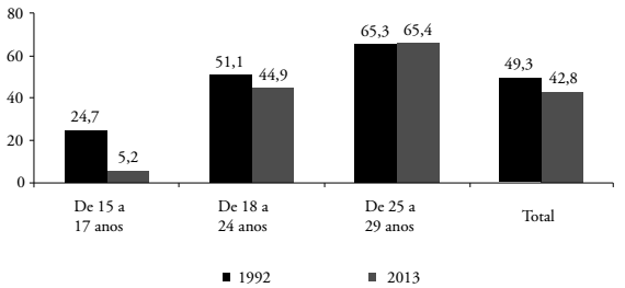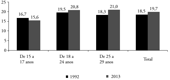 A maior queda na taxa de ocupação ocorreu na faixa de 15 a 17 anos (54,1%), uma vez que em 2013 havia 21,0% dos jovens que estavam ocupados, ante 46,0% em 1992. Também houve diminuição na taxa de ocupados entre jovens de 18 a 24 anos de 3,5% entre os anos de 1992 e 2013. Somente na faixa etária de 25 a 29 anos de idade houve elevação na taxa de ocupação, de 3,5% no mesmo período de tempo (Gráfico 12).