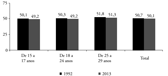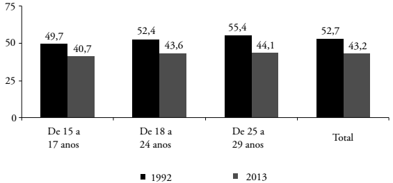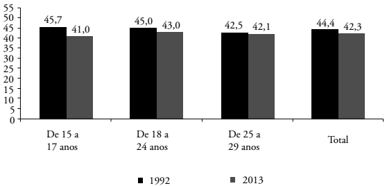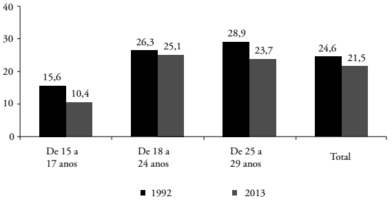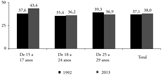 Na faixa de 25 a 29 anos de idade, a taxa de desemprego dos que não estudam foi reduzida em 18,0% entre os anos de 1992 e 2013. Para o conjunto dos jovens de 15 a 29 anos de idade que não estudam, a taxa de desemprego caiu 12,6% no mesmo período de tempo.