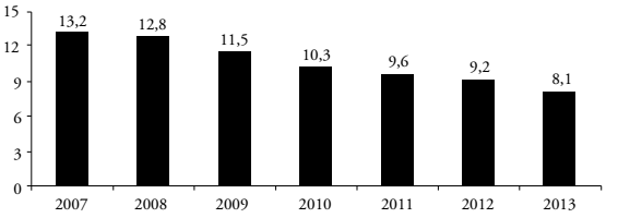 Além disso, observa-se também que a elevação da escolaridade juvenil foi acompanhada da queda na taxa de abandono do ensino. Na faixa etária de 15 a 17 anos, por exemplo, a taxa de abandono caiu 38,6% entre os anos de 2007 e 2013 (Gráfico 9).