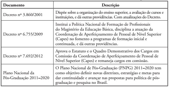 A análise empreendida em relação à documentação da Capes foi exploratória a partir de textos disponíveis na página interna sobre "Legislação" em seu site. Os documentos mais pertinentes estão apresentados no Quadro 1.