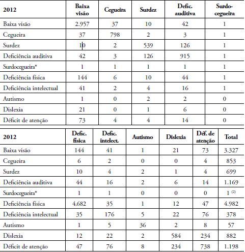 As Tabelas 3 e 4 permitem identificar as quantidades de deficiências informadas no ato da inscrição em 2011 e 2012. Elas deixam claro que, mesmo no caso de deficiências ou transtornos com reduzido número de inscritos - como foi o caso da surdocegueira, em 2012, com apenas uma pessoa - não há deficiência que permaneça sempre isolada, sem a ocorrência ou a associação com outras deficiências e outros transtornos globais do desenvolvimento ou transtornos funcionais específicos. Ainda que de maneira variada, as deficiências múltiplas apresentam presença constante, e algumas delas são relativamente expressivas.