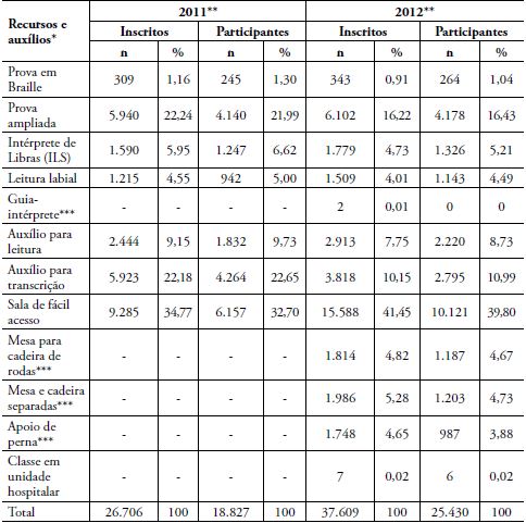 Pelos microdados do Enem, observa-se o aumento do número de participantes que, mesmo sem informar deficiência, solicitaram “prova ampliada” (de 31, em 2011, para 2.264, em 2012), TILS (de 15 para 536), leitura labial (de 8 para 424) e intérprete e leitura labial (de 1 para 142). Nota-se também que, entre os participantes que informaram cegueira no ato da inscrição, 18 em 2011 e 8 em 2012 não solicitaram nenhum recurso ou auxílio para poder realizar as provas.