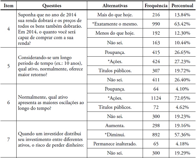 O segundo grupo de itens (5, 6, 7, 12 e 13), referente à educação financeira avançada, buscou explorar a proficiência em relação a instrumentos financeiros mais complexos. Os dois itens que apresentaram maiores percentuais de acerto tratam da oscilação na rentabilidade das ações ao longo do tempo (72,05%) e do entendimento da relação entre risco e retorno (70,4%). Um percentual baixo de acerto foi observado no item referente ao ativo que oferece maior retorno (27,23%), sendo que 26,4% dos indivíduos não souberam respondê-lo.