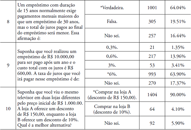 Os itens 1, 2, 3, 4, 8, 9, 10 e 11 são referentes às temáticas pertencentes à educação financeira básica, que teve por objetivo mensurar o conhecimento dos indivíduos quanto a aspectos corriqueiros como taxas de juros simples e compostos, valor do dinheiro no tempo e operações matemáticas simples. Os dois únicos itens que apresentaram um alto índice de acerto (acima de 80%) foram os que abordaram operações matemáticas simples, ao se perguntar sobre uma simples divisão (R$ 1.000,00 / 5 amigos) e diferenciar a melhor alternativa entre duas opções de desconto.