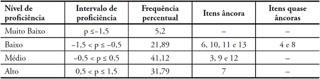 Assim, para um item ser âncora em um determinado nível âncora da escala, ele precisa ser respondido corretamente por uma grande proporção de indivíduos com esse nível de habilidade e por uma proporção menor de indivíduos com o nível de habilidade imediatamente anterior. Além disso, a diferença entre a proporção de indivíduos com esses níveis de habilidade que acertam a esse item deve ser de pelo menos 30%. Portanto, itens âncora são aqueles que caracterizam um ponto ou nível das escalas para o qual a grande maioria dos indivíduos naquele nível o acerta, ao passo que um percentual considerável de indivíduos situados ao nível abaixo da escala o erra. Esses itens têm o objetivo de discriminar pontos na escala que separam indivíduos que possuem daqueles que não possuem determinadas competências ou habilidades.