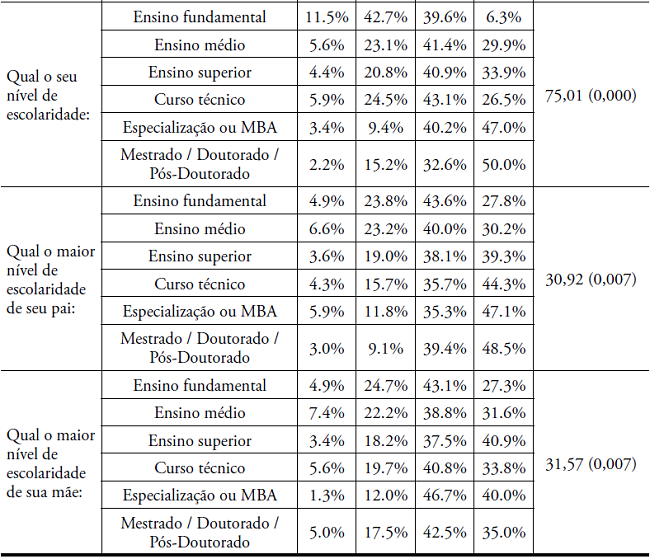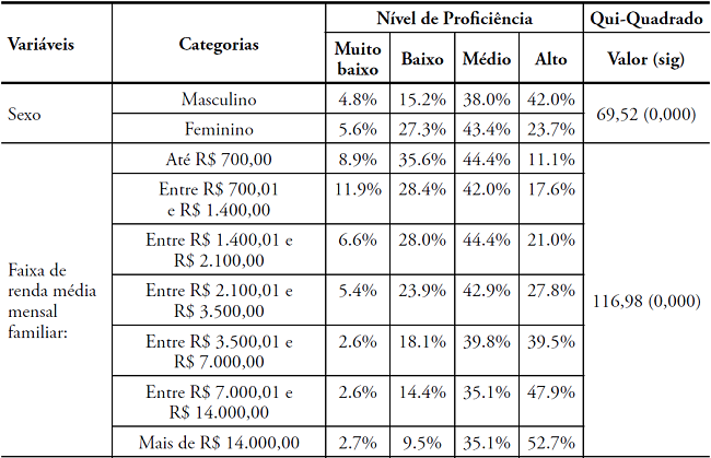 Em seguida, buscou-se avaliar se o nível de proficiência pode estar associado a algumas características do entrevistado (sexo e educação formal) e a educação de seus pais. A Tabela 6 apresenta a distribuição de frequência segundo o nível de proficiência e os resultados do teste χ2.