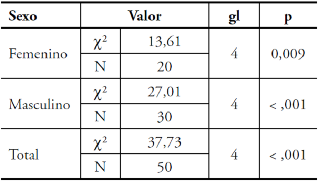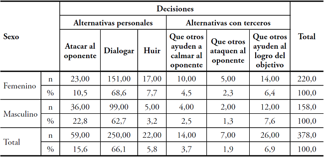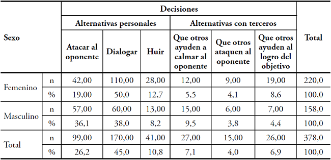 Se encontró una relación significativa entre el sexo y el tipo de decisión tomada para afrontar el conflicto, en caso de igualdad (p = 0,002) y en desventaja (p = 0,013).