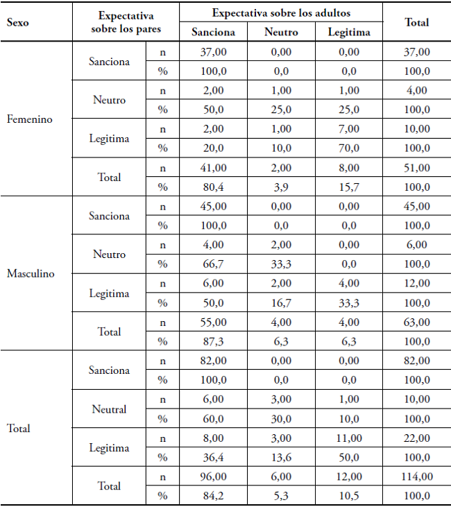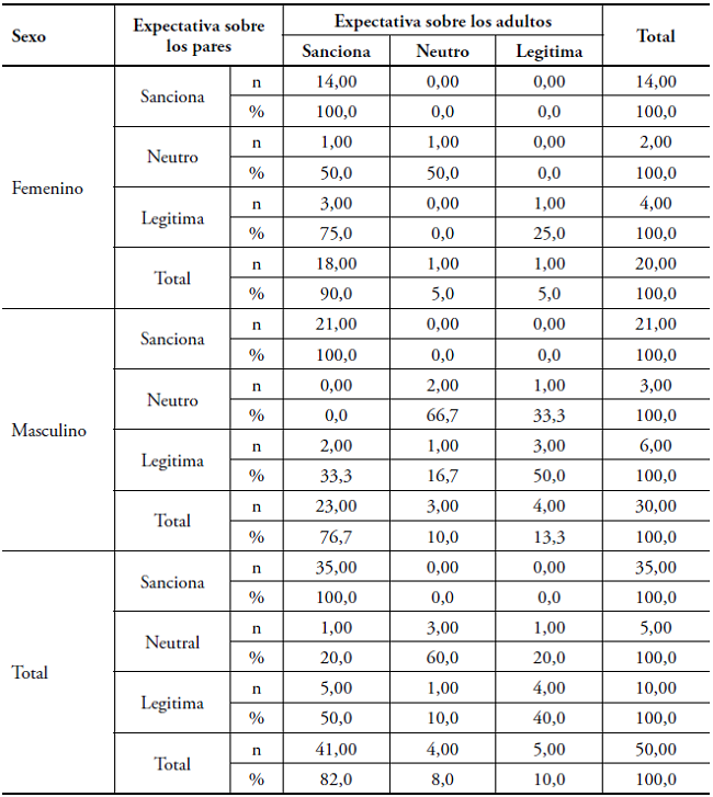 En situación de igualdad se encontró que el 82% de los participantes que espera sanción de los pares también la espera de los adultos, con idéntica distribución en niñas y niños (100%). Se encuentra que el 50% de las niñas espera sanción de los adultos y neutralidad de los pares, mientras que el 20% de ellas espera sanción de los adultos y apoyo de los pares. En el caso de los varones, el 66,7% espera sanción de los adultos y neutralidad de los pares, frente a un 50% que espera sanción de adultos y legitimación de pares. En general, el 50% de los participantes esperó legitimación de pares y adultos. Esto ocurre en el 70% de las niñas y en un 33% de los varones. La expectativa de legitimidad por parte de los adultos y neutralidad de los pares se encuentra solo en las niñas, en una proporción del 25%. La expectativa de neutralidad en pares y adultos, se encuentra en el 30% de los participantes, evidenciándose en el 25% de las niñas y el 33,3% de los varones. El 10% de las niñas y el 16% de los varones esperan neutralidad de los adultos y legitimación de los pares.
