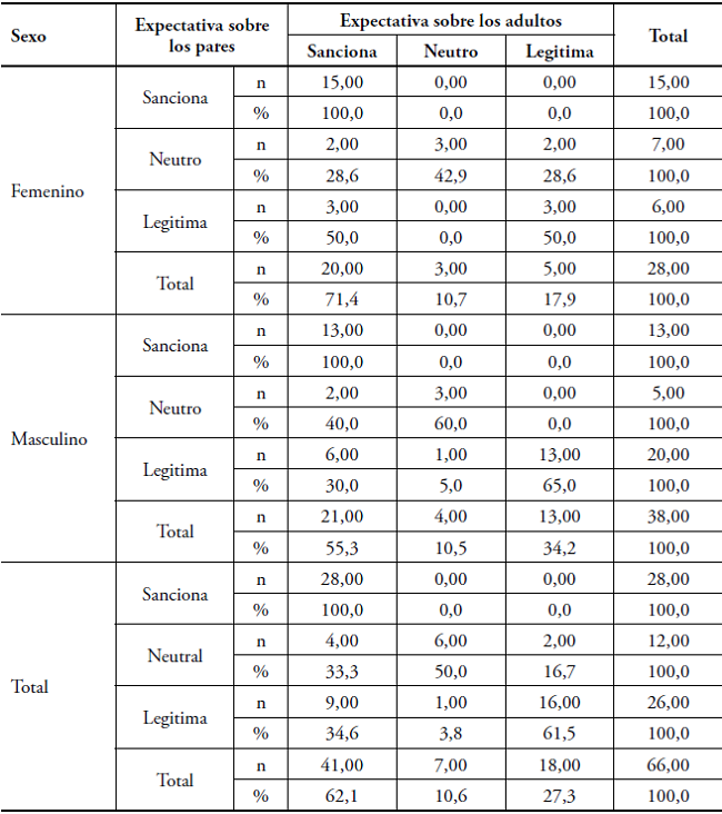 También en situación de desventaja cuando la sanción que se espera de los pares también se espera de los adultos (100%). La sanción de adultos y neutralidad de los pares aparece en el 28,6% de las niñas y el 40% de los niños; la sanción de adultos y legitimidad de pares se presenta en el 50% de las niñas y en el 30% de los niños. La legitimidad percibida tanto en pares como adultos se presenta en el 61,5% de los participantes, siendo presente en un 50% de las niñas y 65% de los niños. El 28,6% de las niñas espera legitimación de los adultos y neutralidad de los pares, lo cual no se manifiesta en los niños. La expectativa de neutralidad de pares y adultos, coincide en el 50% de los participantes, con un 42,9% de las niñas y un 60% de los niños. La expectativa de neutralidad de los adultos y legitimación por parte de los pares solo se presenta en varones (5%).