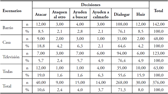 La mayor proporción de participantes frente a la opción de atacar por sí mismos se encontró en los participantes que reportan observar violencia en todos los escenarios (19%) seguidos de quienes la observan en la casa (18,8%). La decisión de dialogar, se encuentra con una mayor tendencia en los niños y niñas que afirman ver violencia en la televisión (76,4%), seguidos de quienes la observan en el barrio (76,1%), encontrándose una amplia diferencia entre quienes la ven en el hogar (64,6%) y quienes señalan todos los escenarios (55,6%). La decisión de huir se presentó más en quienes afirman ver la violencia en todos los escenarios (15,9%) y en el barrio (8,5%).