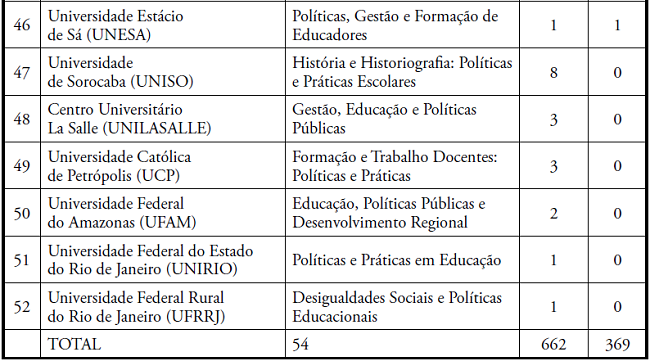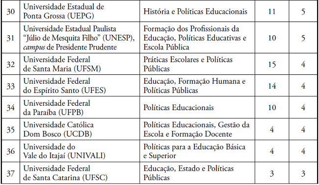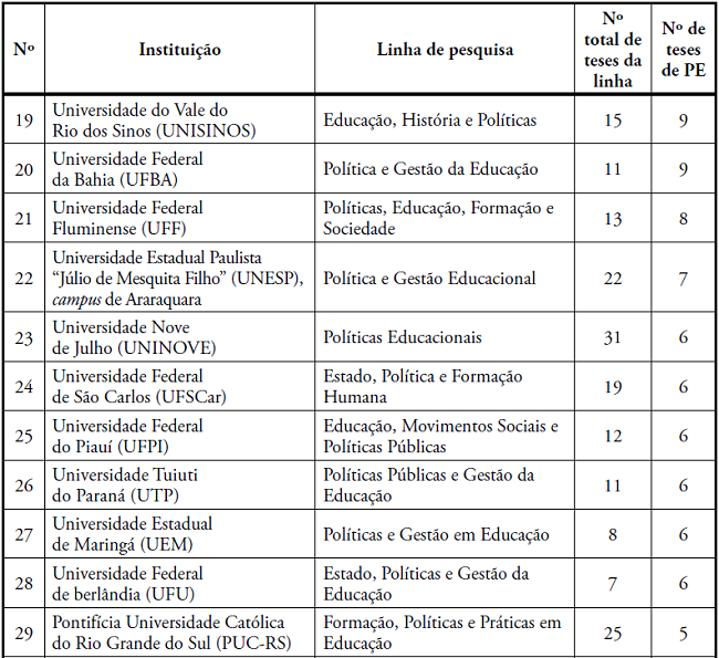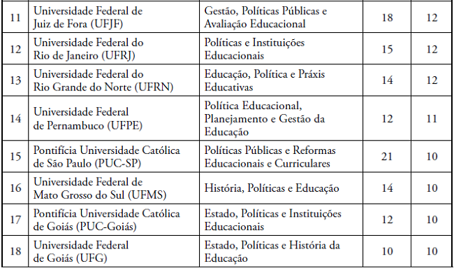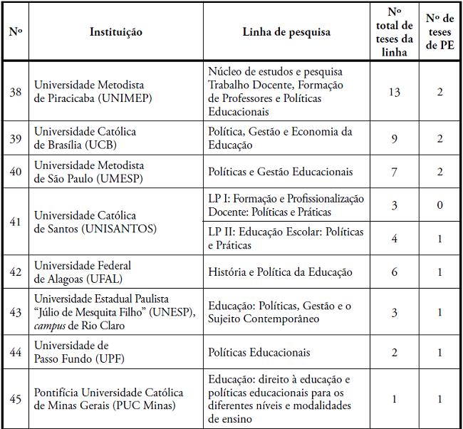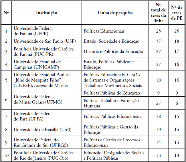 Os PPGE que concentraram maior número de concluintes, com teses mais fortemente articuladas às temáticas do campo da Política Educacional, em ordem decrescente, foram: Universidade Federal do Paraná (UFPR); Universidade de São Paulo (USP); Pontifícia Universidade Católica do Paraná (PUCPR); Universidade Estadual de Campinas (UNICAMP); Universidade Estadual Paulista “Júlio de Mesquita Filho” (Unesp), campus de Marília; Universidade Federal do Pará (UFPA); Universidade de Brasília (UnB); Universidade Federal do Rio Grande do Sul (UFRGS); Universidade Federal de Juiz de Fora (UFJF); Universidade Federal do Rio de Janeiro (UFRJ); Universidade Federal do Rio Grande do Norte (UFRN); PUC-Rio; Universidade Federal de Pernambuco (UFPE); PUC-SP (Currículo); Universidade Federal de Santa Maria (UFSM); PUC-Goiás; e Universidade Federal de Goiás (UFG). No período pesquisado, havia 432 docentes nas LP de Política Educacional, e 219 tiveram concluintes de doutorado; 95 não tiveram nenhum concluinte de doutorado; 90 orientavam doutorado, mas ainda não tinham nenhum concluinte; e 28 já haviam orientado doutorado, mas não tiveram nenhum concluinte no período.