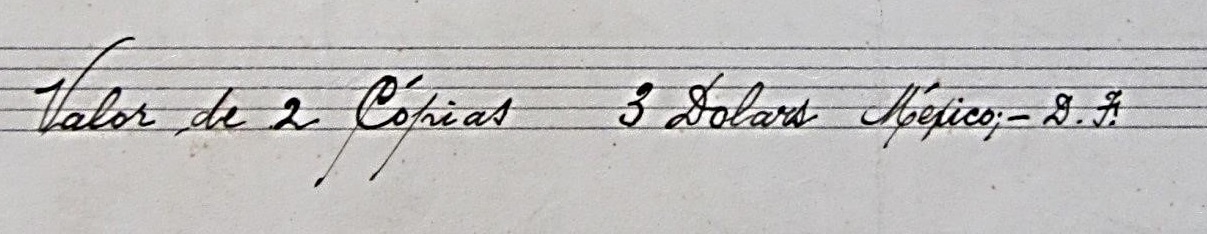 Las copias manuscritas y arreglos se hacían por encargo, era un trabajo bien cotizado y a veces en dólares, lo deducimos por una de las portadas. Es la copia de la danza “Cantar Llorando” y la mazurka “La Cilahuense” −probablemente don Luis Escobedo González mandó elaborar en virtud de que aparece la dedicatoria para la señorita Josefina Escobedo en la ciudad de México− fue adquirida por “valor de dos copias por 3 Dolars; México, D. F.”[19]