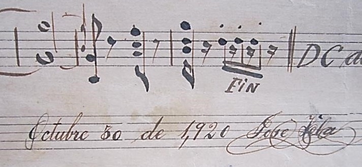 Un hallazgo fortuito en este archivo, fue en sobre de papel manila cosido en máquina con hilo de algodón, una copia hecha por el maestro José Vela y fechada en 1920. Parte de las tareas de los directores de orquesta, era la elaboración de sus propios materiales, al igual que los arreglos según la dotación del grupo. En reciente visita al municipio de Jerez, observamos en su Museo Comunitario una fotografía y descubrimos que José Vela era el flautista en la Orquesta Típica de Jerez en 1918.