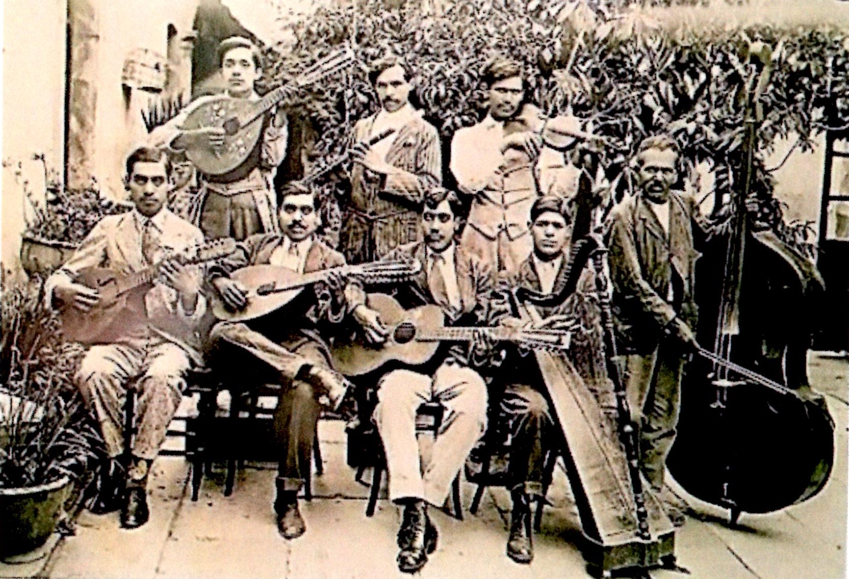 De pie aparecen los señores, Luis Márquez (Bandolón), José Vela (flauta traversa), Heriberto Chávez (Violín) y Julián García (Contrabajo). Sentados Francisco Pérez (Bandurria), Jesús Pérez (mandolina), J. Rosario Gutiérrez (guitarra séptima) y Juan Pablo García (arpa).