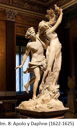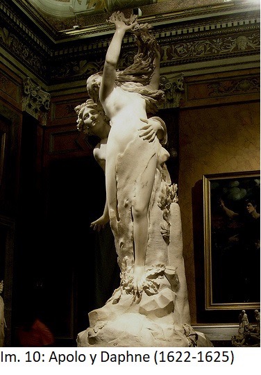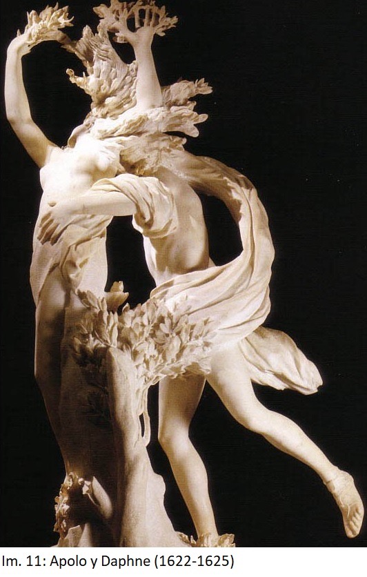 En la escultura "Apolo y Daphne" (Im. 8 a 11) Bernini esculpe el duro mármol dando cuenta de figuras en movimiento y logra captar que las manos de Apolo están hincadas en la carne de Daphne, al mismo tiempo que logra situar el pasaje del realismo a lo fantástico, ya que vemos la transformación de Daphne en laurel (Im. 9 y 11), como en el mito. Además, la escultura captura la emoción de Apolo, joven delgado y con aspectos femeninos, y lo muestra persiguiendo desesperadamente a su amor, en vano. El grito de horror de Daphne y el rostro perplejo de Apolo muestran la preocupación del Barroco por la expresividad, por la utilización por parte del personaje de su capacidad de mostrar el pathos, es decir sus afectos[17].