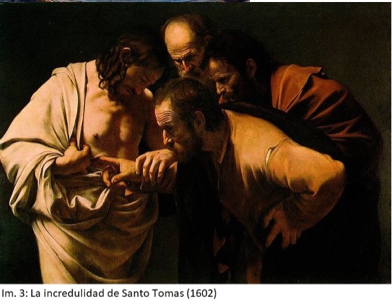 Caravaggio fue uno de los pintores más destacados del Barroco. Su obra “La incredulidad de Santo Tomas” (Im. 3) pintada en 1602 muestra a Cristo resucitado ante sus discípulos entre los cuales Tomás se niega a creer en tal resurrección, por lo que Jesús le ofrece que toque sus heridas para constatar la realidad. ¿Cómo un Santo va a descreer de lo que dice la Biblia? El realismo típico del Barroco se hace presente aquí, al mostrar al Santo como un incrédulo, o sea como a un ser humano. Además, las luces que se logran en el cuadro contribuyen a enfocar la humanidad de la figura.