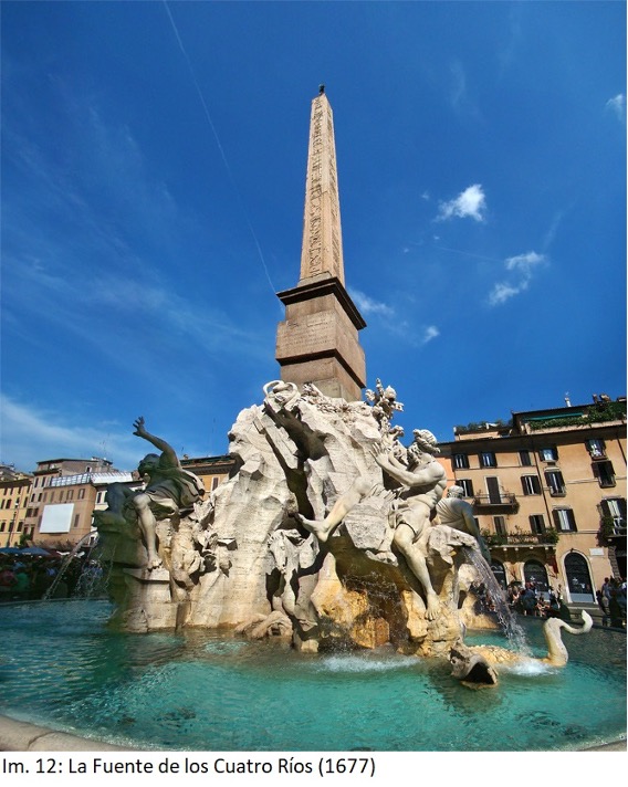 La Fuente de los Cuatro Ríos (Im. 12) es una obra de arquitectura que muestra un verdadero artificio barroco al apoyar el obelisco sobre el vacío del río, al apoyar esa extraordinaria copia romana de un obelisco egipcio proveniente del Circo de Majencio sobre lo inestable del río. Cuatro colosales figuras, sentadas en poses contrastantes, personifican los grandes ríos de los cuatro continentes: el Nilo, el de la Plata, el Danubio y el Ganges. Podría interpretarse como el triunfo de la Iglesia en las cuatro partes del mundo. Lo cierto es que a tanta majestuosidad, tanta solidez, tanto narcisismo, Bernini la asienta sobre lo inestable del agua. Eso es el Barroco.