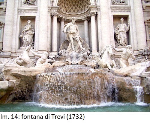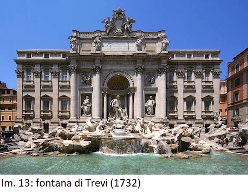 Bernini también fue el gran arquitecto que re diseñó la fontana di Trevi (Im. 13 y 14). La fuente está situada en el cruce de tres calles (tre vie), marcando el punto del Aqua Virgo, uno de los antiguos acueductos que suministraban a Roma. Las terminaciones redondeadas son propias de un estilo que se contrapone a lo lineal del clasicismo. En la escultura hay dos hipocampos. Uno está calmado, para el cual el tritón no tiene que hacer esfuerzo para dirigirlo. En cambio, el otro hipocampo está alterado, y el tritón se las tiene que ver con un esfuerzo. Esto podría representar las dos facetas del mar: el mar agitado y el mar pacífico. Una nueva prueba de la intención del Barroco de revelar el conflicto.