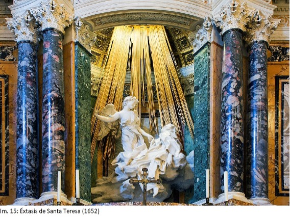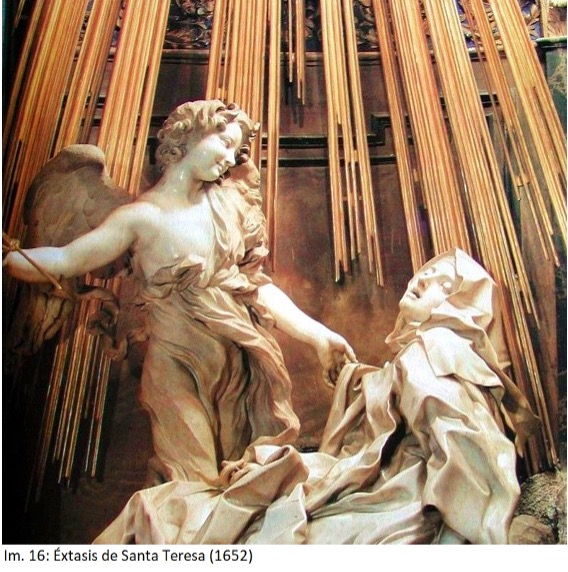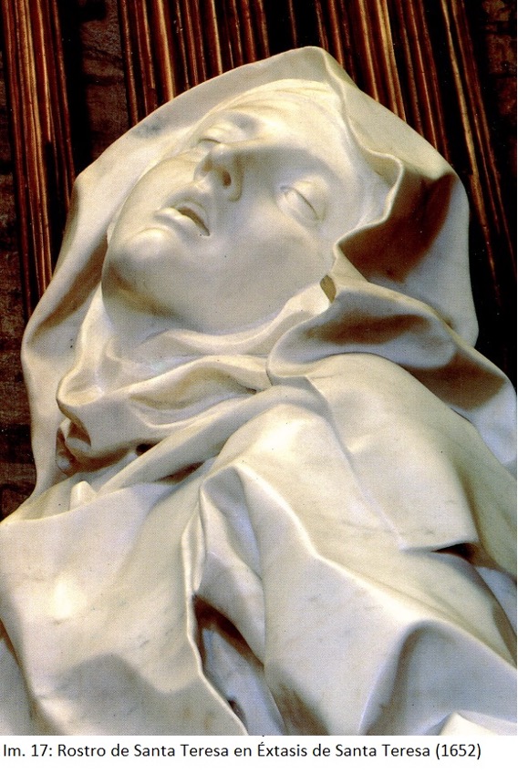 Otra obra fantástica de Bernini es el “Éxtasis de Santa Teresa” (Im. 15 y 16). Allí, el escultor simboliza el momento de clímax que alcanza la Santa mientras está en plena transverberación[21]. En el rostro de la Santa (Im. 17) se observa una expresión de satisfacción, pero está por recibir un flechazo. Es un flechazo de amor divino que sin lugar a dudas le producirá dolor ¿por qué entonces el gesto de placer? Freud llamó más allá del principio de placer donde la pulsión de muerte gobierna la compulsión de repetición. Lacan conceptualizó esto con el término goce. Pero, 300 años antes que ellos Bernini transmitía al pueblo esta idea bajo la palabra “Éxtasis”.