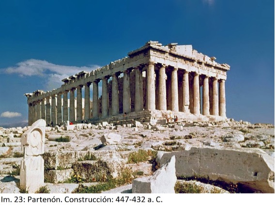 Cuando hablamos de interpretación clásica del mundo lo reservamos, como indica Nusenovich[3], para el arte de Grecia posteriormente re significado en Italia. Específicamente en el siglo V a. C. en Atenas es cuando alcanza su plenitud el periodo clásico estableciendo ideales de belleza y comportamiento humano. En ese tiempo se funda el orden del mundo sobre relaciones de simetría, igualdad, proporciones, estereotipos que se expresa en un lenguaje artístico visual verosímil. El ejemplo paradigmático es el Partenón (Im. 23), una producción arquitectónica que ilustra esta manera de pensar caracterizada por el cuidado perfecto de la distribución sistemática y repetitiva de los pilares formando una idea armónica y equilibrada del edificio.